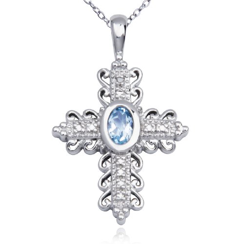 This fancy small cross pendant centers a faceted oval of sky blue topaz in a setting of bright sterling silver. Diamond illusion texturing and a genuine diamond accent enhance the design. The pendant comes complete with an 18-inch cable chain.