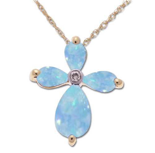 Buy 14k Yellow Gold Created Blue Opal and Diamond Cross Pendant, 18" Now