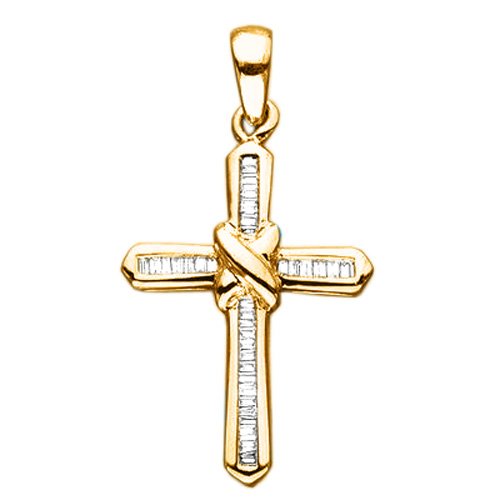 Make a declaration of faith with this stunning cross pendant. Gleaming yellow gold is crafted into a gracefully swooping modern cross design and then studded with thirty three fiery baguette shaped diamonds weighing 1/4 ct (Tw.). A look you will treasure every day.